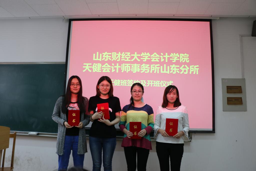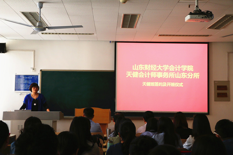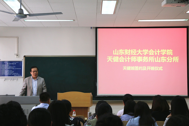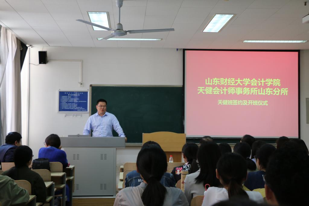 5月4日,bat365官方官网天健会计师事务所山东分所天健班签约及开班仪式在燕山校区逸夫楼108教室隆重举行。天健会计师事务所高级合伙人、山东分所总经理刘加宝,副总经理韩炳海,bat365官方官网党委书记张涛、副院长孙文刚等出席了本次仪式,入选天健班的40位同学共同参加。