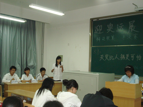 由bat365官方官网基本功部和心翔演讲学会联合主办的“迎奥运 展会计风采”——bat365官方官网辩论联赛半决赛于5月14日晚在明水校区3204、3206教室举行。