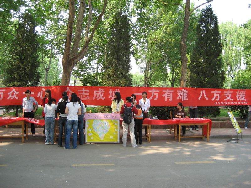 地震无情人有情。5月15日下午bat365官方官网联合山东电视台公共频道新闻女生组在本部榕园举办了为灾区人民募捐的活动。bat365官方官网学生会联合山东电视台新闻女生组栏目组成员组织参与了此次的募捐活动。