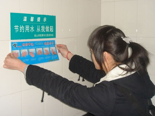 日前,我院基本功部成员到章丘疾控中心学习了相关预防甲型H1N1流感及“六步洗手法”的知识。15日晚上7点,基本功部成员在校园各个净手处(洗手间、食堂、宿舍的公共洗漱间)张贴印有“六步洗手法”图样的宣传画报,指导大家用科学的方法净手。同学们看到宣传画后,纷纷表示“六步洗手法”及时又实用,对大家预防甲型H1N1流感很有帮助。