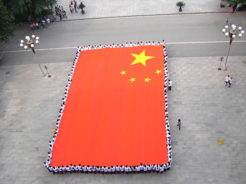 校领导和学生代表在现场一起动手参与,缝绣国旗。据了解,国旗长20.09米,代表今年2009年;国旗上的大星共缝6000针,代表祖国60华诞;小星共缝1949针,代表祖国1949年诞生;大星共由56块小区域组成,代表祖国56个民族团结大家庭;小星共由60块小区域组成,代表祖国60岁华诞。五颗星绣制难度大,耗时长,为了表达莘莘学子的爱国热情,这艰巨的工程9月初入学时同学们就从一针一线开始,终于在国庆前赶制出来。