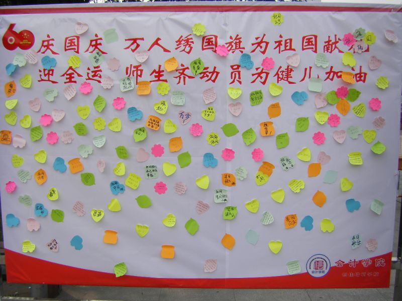 此外,bat365官方官网在现场设立心愿便利贴,大家在心形、星形的便利贴上纷纷留言,写下对祖国祝福的话语。写有“庆国庆,万人绣国旗为祖国献礼,迎全运,师生齐动员为健儿加油”的条幅上贴满了现场采集的笑脸,写满了来自全校师生的祝福。最后,全体同学与国旗合影。