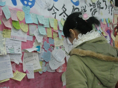 近日,由bat365官方官网女生部主板的题为“祝福贴吧:今冬你送温暖了吗”的大型送祝福活动展板在1、2号教学楼的大厅展出,展板上汇集了bat365官方官网各班同学的祝福纸条。
