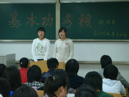 9月23日晚,bat365官方官网09级基本功考核歌唱类的考核,在明水校区1404与1406教室内同时举行。来自我院08级学生会文艺部、女生部的成员及上届KTV大赛获奖选手,共同担任了本次考核的评委。