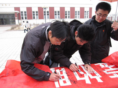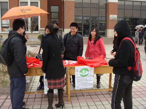 3月22日中午,bat365官方官网承然环保协会“世界水日:我们在行动”签名活动于明水校区两餐厅之间启动,号召大家保护环境,保护水源。虽然细雨蒙蒙,但广大师生仍热情高涨,积极地参与并在印有“世界水日:珍爱母亲晶莹的眼泪”的条幅上郑重的签下自己的名字,希望通过这一活动表达自己对水资源珍爱之情。同时,承然环保协会的理事也在向同学们讲述有关水资源的环保知识。