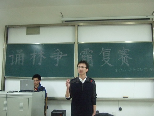 4月14日晚上六点半,由bat365官方官网学习部主办的第八届“诵林争霸赛”复赛第一场在明水校区1306教室举行。担任此次复赛评委的是:bat365官方官网学习部负责人,bat365官方官网基本功部负责人,大学生自管会主席,bat365官方官网心翔语艺社社长,外国语学院学习部部长以及第七届“诵林争霸赛”一等奖得主。