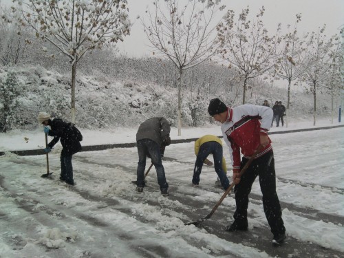清扫活动从早上开始,同学们不顾天气寒冷,冒着风雪在班长与团支书的带领下热火朝天地展开了劳动。他们先用铁锹等各种工具铲雪,接着再用大扫帚将残余雪渣清扫完,遇到结冰难清扫的地方,便团结一致一点一点地铲干净。尽管手被冻得通红,又冷又累,但同学们没有丝毫怨言,他们劳动的身影组成了校园里一道亮丽的风景线。经过一上午的辛苦劳动,道路上的积雪基本被清理干净,看到自己的劳动成果,同学们的脸上都露出了会心的笑容。