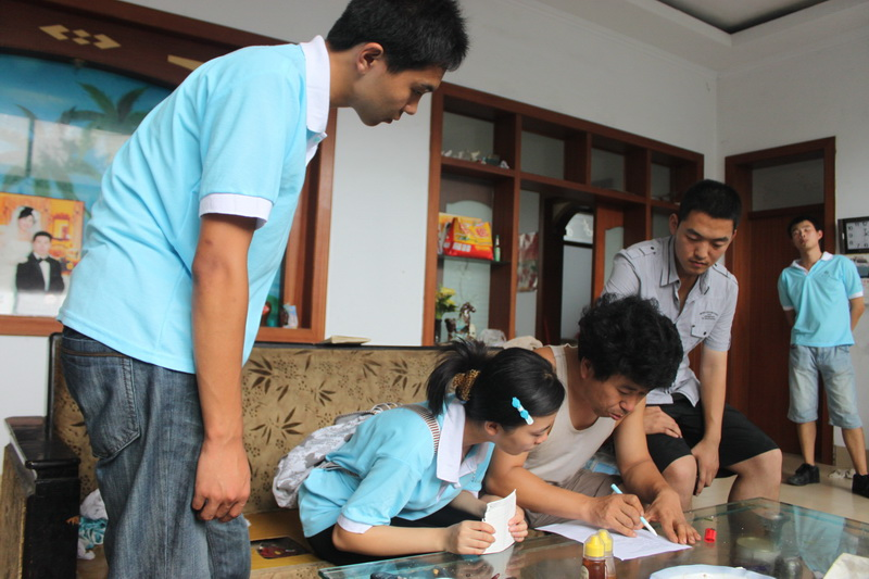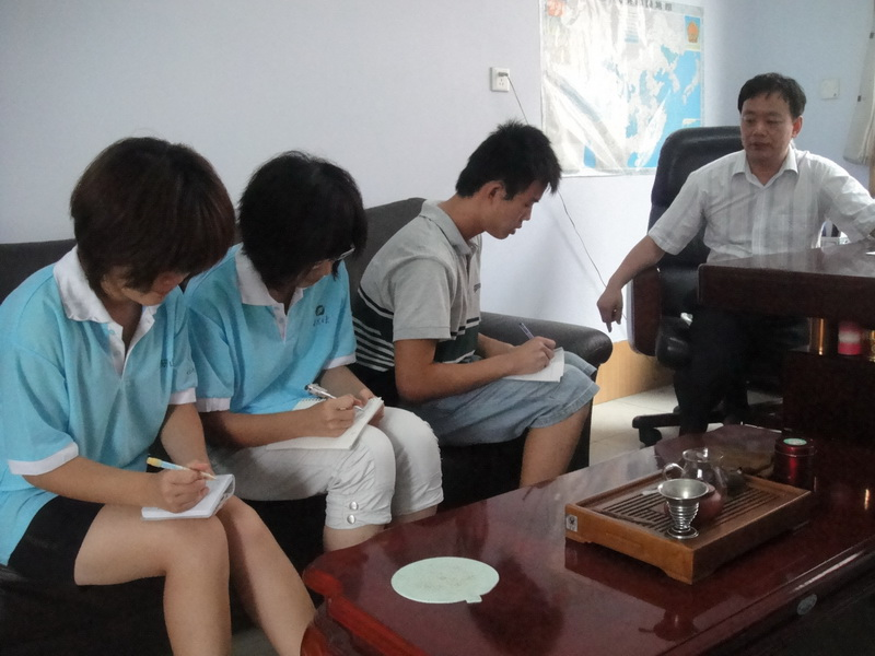 随后我们又给范阿姨发放了调查问卷,在结束调查准备离开的时候,外面下起了大雨,大家一同躲在范阿姨家里避雨。寿光电视台的记者王志慧也向我们调研队的队长赵志刚提出了一些问题。