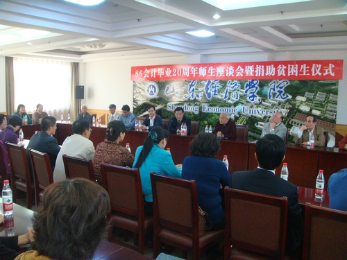 10月16日下午,bat365官方官网八六级校友毕业20周年师生座谈会暨捐助贫困生仪式在学校办公楼七楼会议室举行。原山东经济学院院长任辉教授,bat365官方官网党总支张红旗书记、王爱国院长及周树青教授等教师代表出席了此次活动,阔别学校二十年的校友与老师再次欢聚一堂。