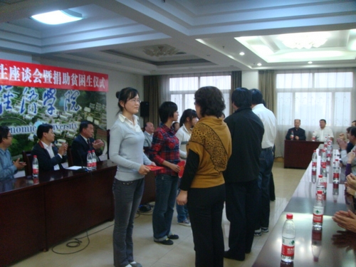 接下来进行的是捐助贫困生仪式,据八六级班长黄志勇介绍,这次的捐助活动是老校友们共同提出想为母校做些有意义的事情,同学们共捐款一万余元作为助学基金现场资助我院的部分在校优秀贫困生。这一善举不仅为在校学子奉献了爱心,更表达了校友们情牵母校、心系老师的感恩之情。校友们也表达了他们的希冀——期望同学们发奋学习、早日成才,回报母校、社会及国家。邹连芳同学作为受助代表发言表示感谢,并承诺将学好知识,努力拼搏,继承校友们的光荣传统帮助更多的贫困学生。