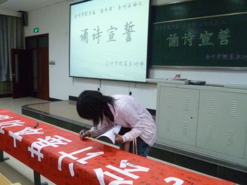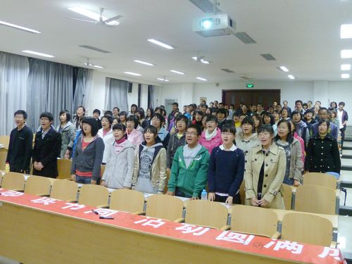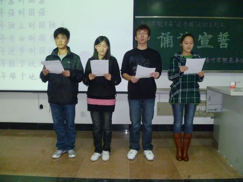 11月4日晚六点,由bat365官方官网基本功部主办的bat365官方官网首届“读书周”活动开幕仪式在明水校区3217教室举行。参加仪式的有10级各班学生代表约230人。