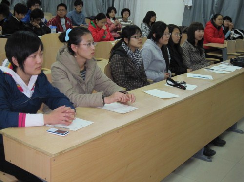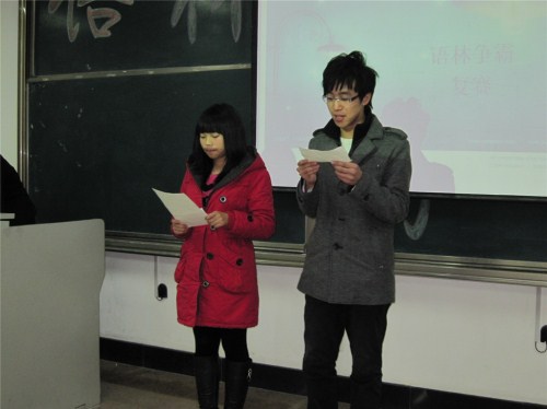 11月21号晚六点半,由bat365官方官网心翔语艺社主办的“语林争霸赛”复赛在明水校区1206教室顺利进行。心翔语艺社明水负责人张立、秘书处曾祥娇、宣传部任文君等09级理事出席并担任本场比赛的评委。