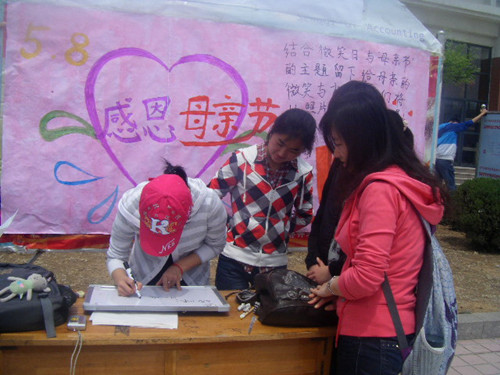“母亲”本是个平凡的词语,但母亲永远是平凡中见伟大的人物。她赐予我们生命,含辛茹苦将我们抚育成人。斑白了黑发,燃尽了青春。5月8日,又到了一年一度的母亲节。我院承然环保协会特别推出感恩母亲节活动,希望可以借此为大家提供一个向母亲说出我们心中之爱的平台。活动参加方式很简单,同学们只需在留言板上写下想对母亲说的话,并与留言板合照留影即可。温馨的展板吸引了来往同学,大家纷纷拿起笔,写下埋藏已久的心里话。有质朴的“妈妈您辛苦了,节日快乐”;也有浪漫的“您是一棵大树,春天倚着您幻想,夏天倚着您繁茂,秋天倚着您成熟,东西倚着您沉思,我爱你妈妈”;更有诙谐的“我若是大款,您就是大款的妈妈;我若是总统,您就是总统的妈妈。不管将来儿子是什么,我都永远爱您。”一个小小的留言板,写不尽大家对妈妈千言万语的感恩与思念。据悉,此次活动将持续两天,5月7日下午,由承然环保协会成员评出30份优秀作品。获奖作品,协会将免费为大家邮寄回家。