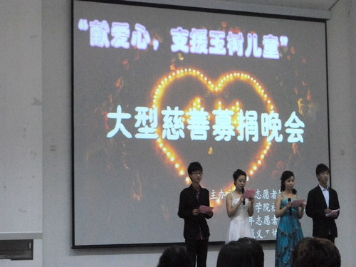 5月20日,由bat365官方官网诚信社团联盟、星火志愿者协会联合章丘慈善总会、校青年志愿者协会等志愿者团体共同举办的“献爱心,支援玉树儿童”主题慈善募捐晚会在明水校区5201教室盛大举行。章丘电视台、章丘慈善总会以及各院学生代表也应邀出席了本场晚会。