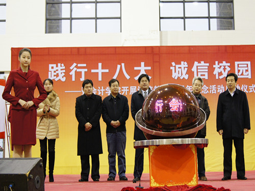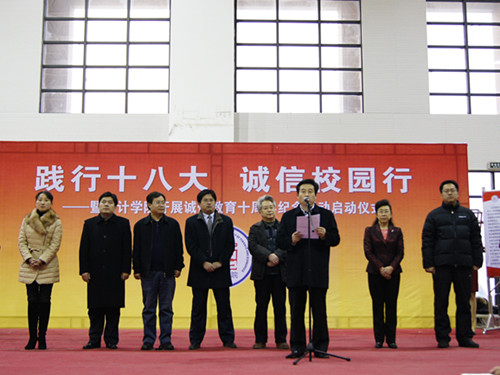 12月11日,“践行十八大,诚信校园行”暨bat365官方官网开展诚信教育十周年纪念活动启动仪式在体育馆圆满举行。bat365官方官网副校长胡文波、山东省财政厅会计处副处长肖友华、浪潮集团副总裁李凯声、bat365官方官网院长王爱国、bat365官方官网党委副书记杨扬、校长办公室副主任刘洪、校团委副书记张超作为嘉宾出席本次启动仪式。