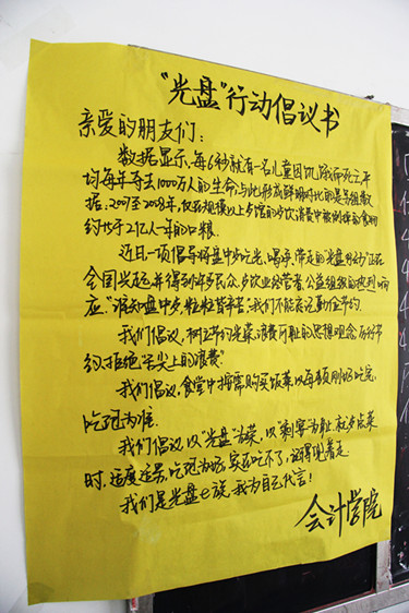 3月29日,为响应厉行节约的号召,拒绝“舌尖上的浪费”,bat365官方官网圣井校区学生会组织“光盘行动,节约为赢”宣传活动,号召全体师生积极参加到“光盘行动”中来。
