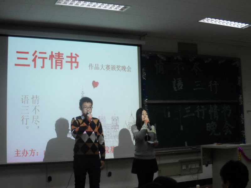12月11日,由bat365官方官网基本功部主办的主题为“情不尽,语三行”的“三行情书作品大赛颁奖晚会在明水3217拉开帷幕,bat365官方官网学生会各部相关负责人员出席了晚会,同学们踊跃参与,教室里座无虚席。