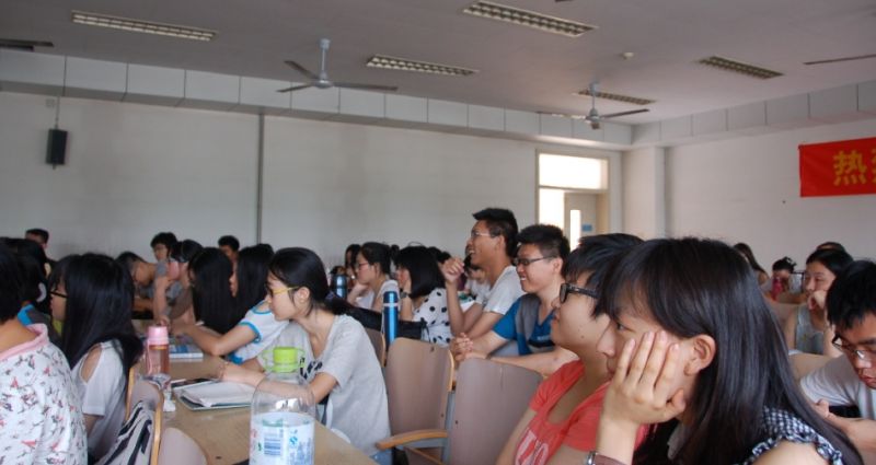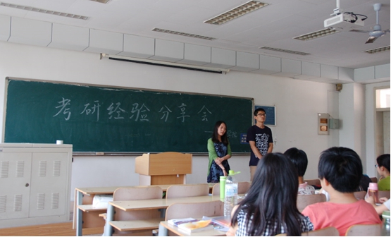 最后,“准考研生”们和两位校友开始了愉快的“交谈之旅”,现场提问不断,学长学姐都结合考研心路和自己的经验一一耐心解答