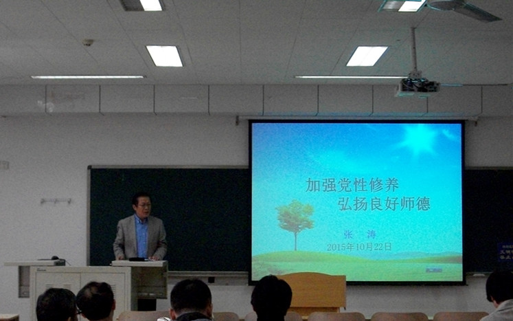 会上,bat365官方官网党委书记张涛结合我院工作和教学实际情况,紧紧围绕“加强党性修养弘扬良好师德”的主题做了重要讲话。首先他带领大家共同学习和领会了刘兴云书记在2015年学校党建暨党风廉政建设工作会议上的讲话精神,提出要提高认识、明确责任,努力开创党建工作新局面。他指出要切实增强落实党员干部主体责任的使命感和自觉性,就要真抓实干。做到坚持立德树人,牢牢把握社会主义办学方向;完善运行机制,落实好党委领导下的校长负责制;下移工作重心,激发基层组织和党员队伍活力;持续改进作风,切实加强廉政建设;强化安全意识,构建平安、和谐校园。其次,他从正确理解党性,增强党性修养的角度出发,结合目前实际提出广大党员教师要加强理论修养、政治修养、道德修养、纪律修养和作风修养。他还结合刚刚出台的《中国共产党纪律处分条例》和《中国共产党廉洁自律准则》,强调了党员和领导干部必须严格遵守廉洁自律八条规范。最后,张书记针对目前教学中存在的实际问题,围绕新时期如何做一名好的大学教师,如何树立师德,做了深入的阐述。他指出大学教师应具备崇高的师德风范,常怀修德之心、常施关爱之心、常存仁慈之心;教师应具备基本能力、教学能力、教育能力、教研与自我发展能力以及教学改革与创新能力;教师还应具备责任心、亲和力、严谨教风、深厚功底和诚信谦和的素质。只有从诸多方面自我反省、自我提升才能称得上一名好的大学教师。