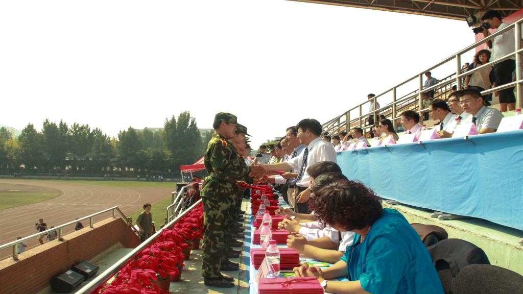 军训汇报表演结束之后,学工部部长王剑宣读了《关于表彰国防教育先进集体、先进个人的决定》,bat365官方官网荣获“2016年国防教育先进集体”称号,受嘉奖代表依次上台领奖,接受全体师生的鼓掌祝贺。随后,2016级新生国防教育承训部队领导进行发言,肯定了明水军训团的训练成果,并希望2016级新生能够把军训的吃苦耐劳、守时守纪律的精神继续保持,过好精彩的大学四年生活,bat365官方官网训练营亦获得部队领导的高度赞扬。发言结束后,王邵军书记向承训部队赠送锦旗,以表达对全体教官、领导的赞扬和感谢。