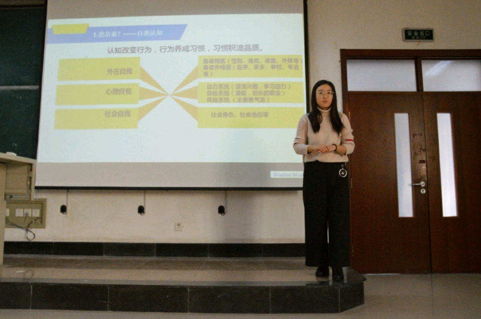讲座开始,陈娇娇老师先与同学们互动做了一个心理学上的催眠实验“老鼠,老鼠,老鼠”,活跃了现场的气氛,也使同学们对本次讲座更加充满期待。本次讲座围绕“我是谁?我在哪?我要去哪?如何去?”四大板块展开。在“我是谁”,即自我认知方面,陈娇娇老师强调“不要被外在的事物干扰,要澄清自己内心的想法”。“对于小环境而言,在校内要了解自己的室友、班级同学、社团伙伴;从大环境来讲,我们应明确自己的专业发展与未来就业前景,”这是陈娇娇老师从自我定位方面对同学们提出的要求。“自我规划既包括短期规划,也包括长远规划。明确未来发展方向有利于我们走好现在的每一步”,陈娇娇老师的话得到了在座同学的一致赞同。最后是自我管理的内容,陈娇娇老师通过自己的经历与成果从时间、情绪、学习、人际四个方面阐述了自己的观点,令同学们受益匪浅。