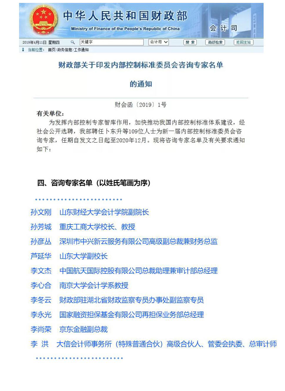孙文刚入选财政部内部控制标准委员会咨询专家