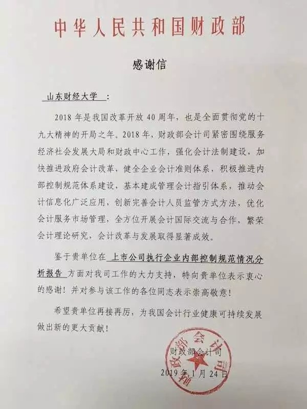 财政部会计司发来感谢信,对我院在2018年《上市公司执行企业内部控制规范情况分析报告》方面所做的工作表示感谢 |
