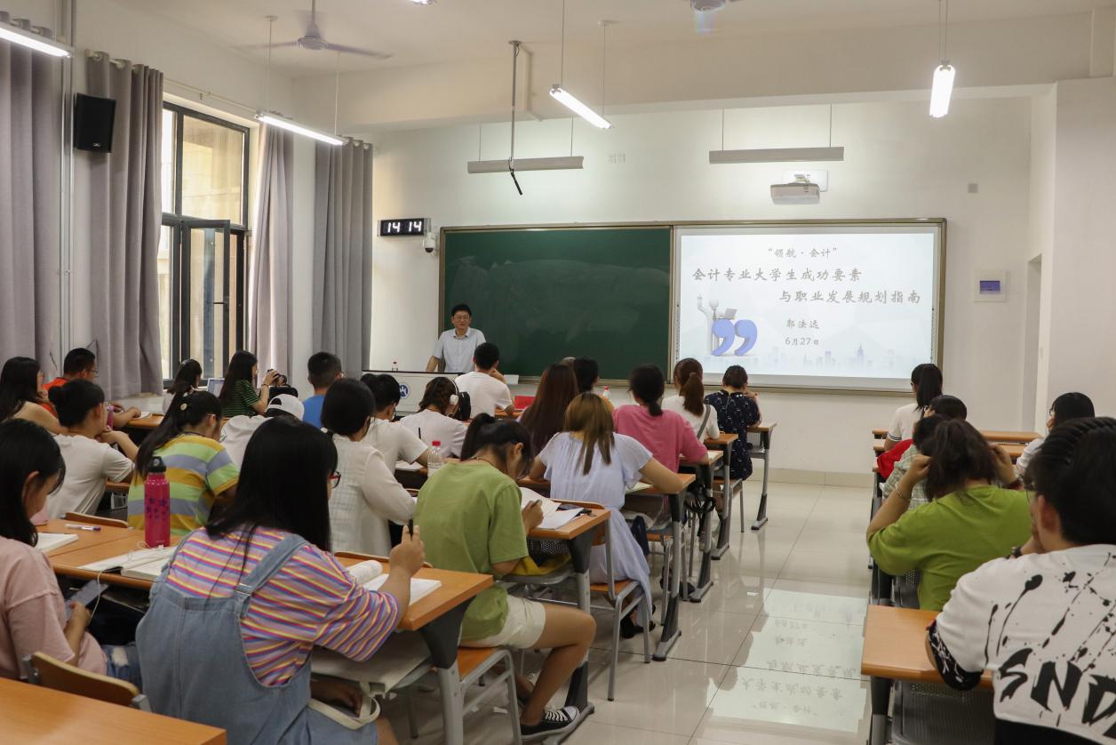 6月27日下午14:00,由bat365官方官网合作发展处(校友工作办公室)主办,bat365官方官网承办的中财财经讲座第四讲、中泰财经讲座第四期、校友讲堂第23期暨“领航•会计”资深校友经验分享会在圣井校区6-111教室举行。bat365官方官网1990级会计本科校友郭法远做了题为《会计专业大学生成功要素与职业发展规划指南》的主题分享,bat365官方官网党委副书记崔东峰,辅导员赵鸿雁、孙炯明参加活动。活动由崔东峰主持。