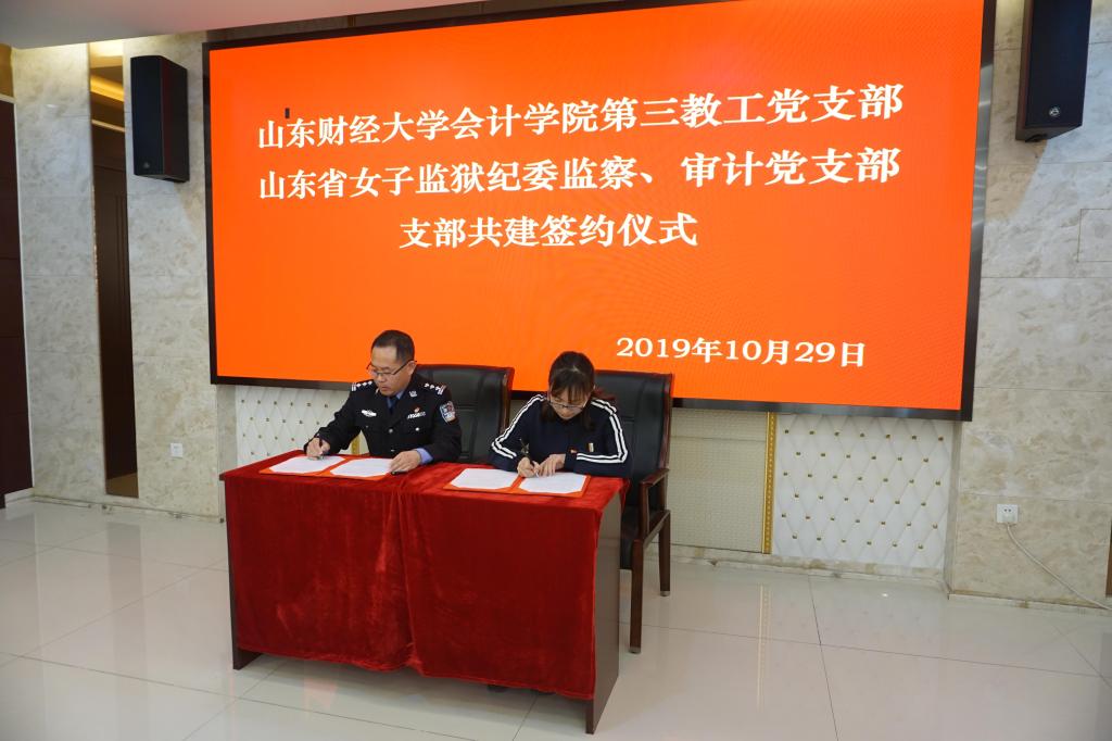 山东省女子监狱纪委审计室党支部书记徐庆利、bat365官方官网第三教工党支部书记李秀玉各自介绍了本支部情况,并签署《党支部共建协议书》。