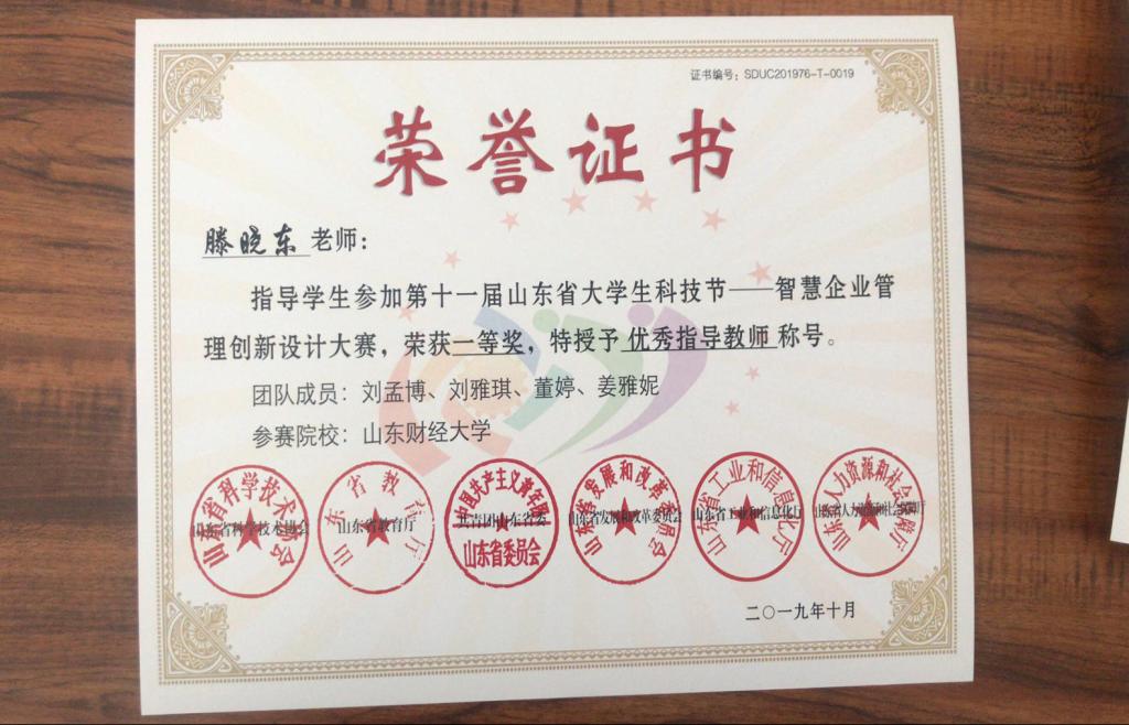 由我院会计信息化部副主任滕晓东博士指导的参赛代表队,在本次大赛中荣获山东省智慧企业管理创新设计大赛一等奖。