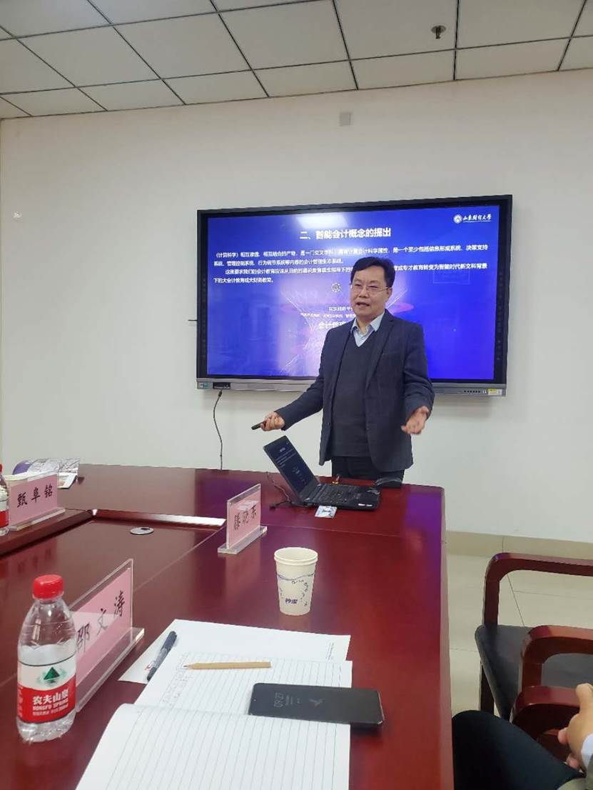 王爱国向来访客人详细介绍了我院智能会计专业的建设历程和系统思考。他强调,以大数据、人工智能、移动互联网、云计算、物联网、区块链为代表的新技术对人类经济社会生活的影响越来越大、越来越深远。人工智能技术在会计领域的应用也越来越广泛、越来越深入,会计工作未来会不会被人工智能所取代,会计专业和会计职业在未来还有没有前途,会计人才培养和会计教育教学应该如何转型发展,会计教育工作者是固守一方“原地不动”,还是拥抱技术“顺势而为”。凡此种种,都需要我们做出明确的响应和回答。bat365官方官网在全国率先设置了“智能会计”专业方向,厘定了新的培养目标和要求,重构了新的知识结构和能力框架,确定了新的专业课程和教材内容,搭建了新的教材体系,正在努力探索一条可复制、可示范、可推广的智能会计发展之路,非常希望在这个过程中得到东北财大的支持和帮助。