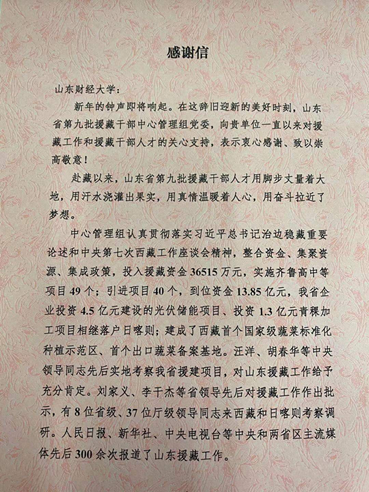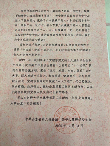 近日,一封来自中共山东省第九批援藏干部中心管理组委员会的感谢信被转送到了我院。信中高度肯定和表扬了我院王勇老师在西藏日喀则市审计局的优异表现。