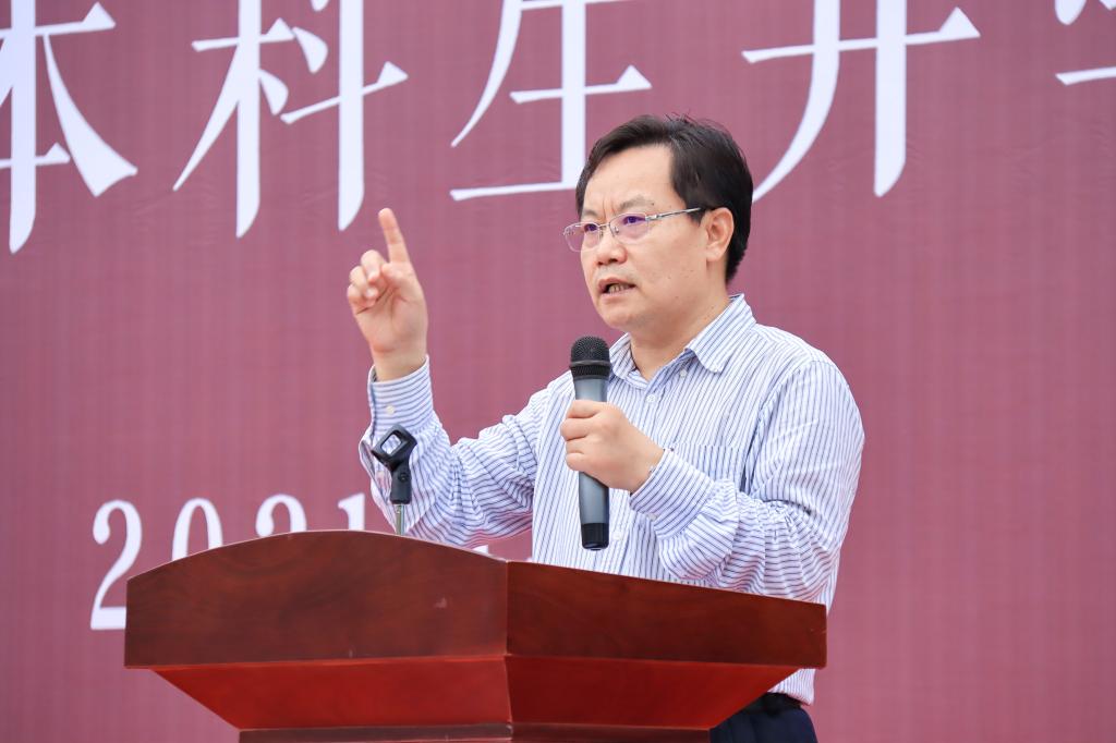 典礼在国歌声中拉开帷幕。邵文涛首先对2021级本科生表示热烈欢迎,他从新时代新青年的责任和中华民族的伟大复兴两个方面,向大一新生提出要求,强调作为新时代新青年,在思想上要胸怀远大理想,树立正确世界观、人生观和价值观,将人生规划与国家发展需要结合起来,积极承担时代赋予青年的强国重任。作为中华民族新生力量,大学生在实践方面要脚踏实地,砥砺前行,为中华民族伟大复兴、为人类命运共同体而不懈奋斗。最后,邵文涛勉励同学们要勇于创新、追求卓越、胸怀天下、厚植家国情怀,希望同学们能够脚踏实地、砥砺前行,创造山财大和bat365官方官网新的辉煌。