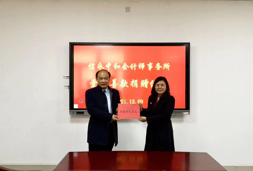 12月9日,信永中和会计师事务所合伙人王兆勇,行政总监王长勇,人力资源部经理赵秀丽来到学院为我院穆京同学送来了五万元人民币的爱心的捐款。学院党委书记邵文涛、副书记付亚,院长助理韩跃老师参加了捐赠仪式。