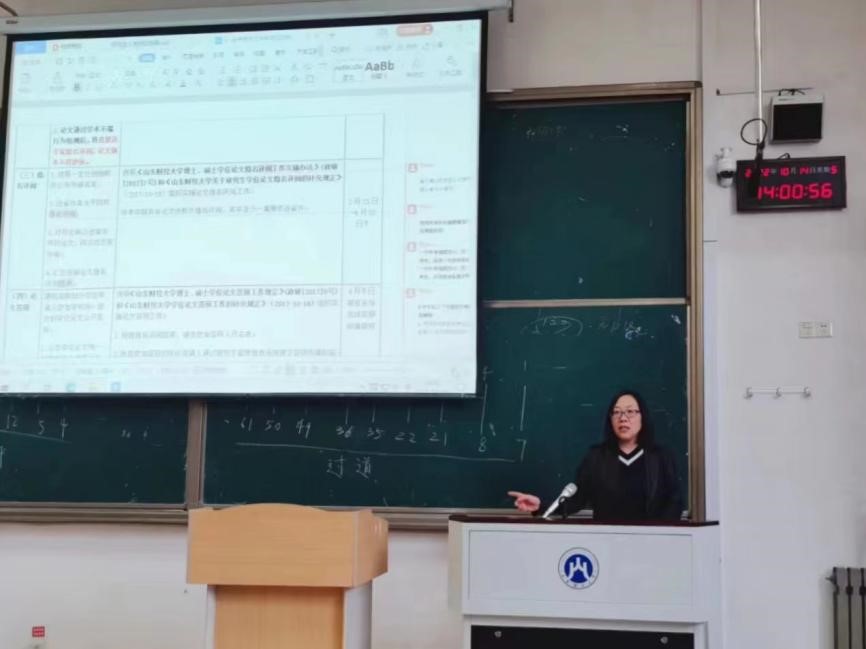 王斌和刘明辉分别向同学们介绍了研究生学习和生活方面的内容,王斌建议同学们认真完成课程学习,以建立专业思维方式和知识体系,并鼓励同学们要积极主动地与导师沟通交流,充分了解相关研究领域,做好学业规划。刘明辉则向同学们简要说明了研究生教学管理系统的功能和使用方法,以及bat365官方官网在导师选择和课程选修方面的相关要求,她建议同学们善用、活用研究生教务管理系统,及时关注发布的最新消息。