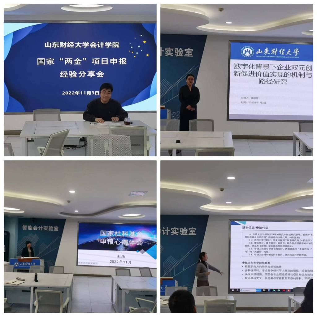 为持续推进有组织的科研,不断提升教师科研水平,推动学院国家“两金”项目申报工作,我院于11月3日下午在智能会计实验室举办国家“两金”项目申报经验分享会。学院党委书记邵文涛、副院长王守海及青年教师参加了活动;院长葛永波、财务管理系主任朱炜、智能会计系副主任李瑞雪和会计学系宋蕾蕾分别介绍了申报国家社科、国家自科的学术历程和经验。分享会由副院长吴大新主持。