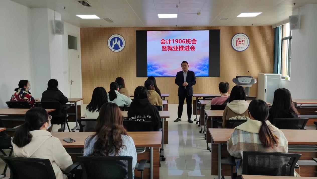 会计1906班是一个团结奋斗的班集体,目前学习考研就业等各项工作稳步推进,邵文涛鼓励同学们要保持良好心态,认真准备考研复试,努力实现自己的青春梦想。邵文涛指出,今年高校毕业生数量较多,当前就业形势依然严峻,学校高度重视毕业生就业工作,目前到学院招聘企业多,同学们要积极就业,调整就业心态和就业思路,抓住就业机会,努力走上更好工作岗位。