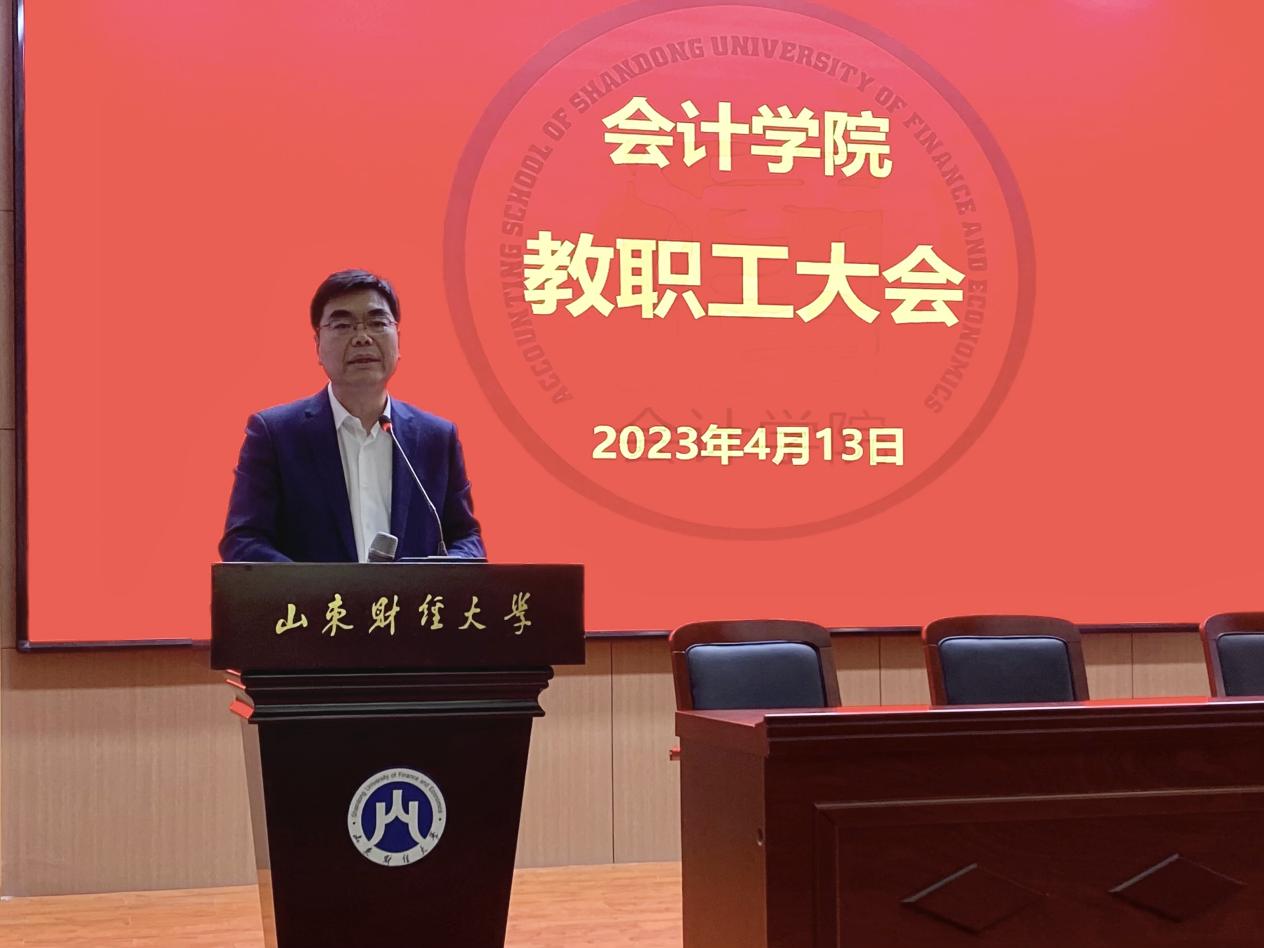葛永波结合学校党委第一巡察组巡察bat365官方官网党委情况反馈对2022年度学科建设、教学改革、科研工作、人才引进等重点工作进行总结,就学院2023年度重点工作进行了部署。他强调,一是创新工作方式,加强数字化课程体系建设,强化教师数字思维和智能思维,不断推进会计智能化全面发展;二是提升教师职业素养,强化职业道德,持续提高教学质量;三是重视人才培养,持续优化学科专业布局、完善培养体系,全面提升研究生培养质量;四是完善学院荣誉体系建设,激励教职工担当作为,优化教学科研氛围。他勉励全体教师潜心科研,凝心聚力、携手奋进,守望教育沃土,静待花开果熟,期许全体教职工为学院高质量发展作出新的贡献。