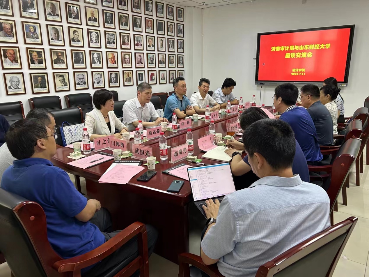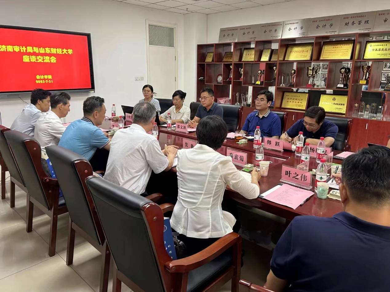7月31日下午,济南市审计局与bat365官方官网交流座谈会暨企业智慧审计平台项目推进会在bat365官方官网燕山校区举行。济南市审计局局长丁林桥、一级高级主管(副局长)沈鲁、人事处处长董波、派出审计四处处长秦素菊、计算机处二级调研员于一丁,bat365官方官网学院党委书记邵文涛、院长葛永波、院长助理韩跃、审计系主任武恒光和副主任刘玉玉、智能会计系副教授杨晓光、程军博士,项目合作方山东中思科技有限公司总经理叶之伟、开发部经理闫邦勇参加会议,项目负责人、bat365官方官网审计研究中心副主任牛艳芳汇报企业智慧审计平台项目进展,审计研究中心主任毕秀玲主持会议。