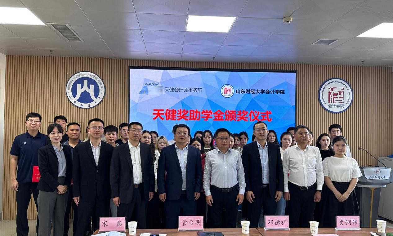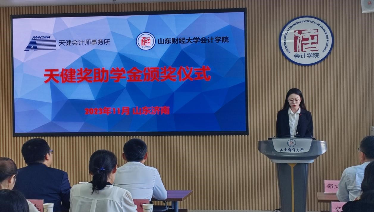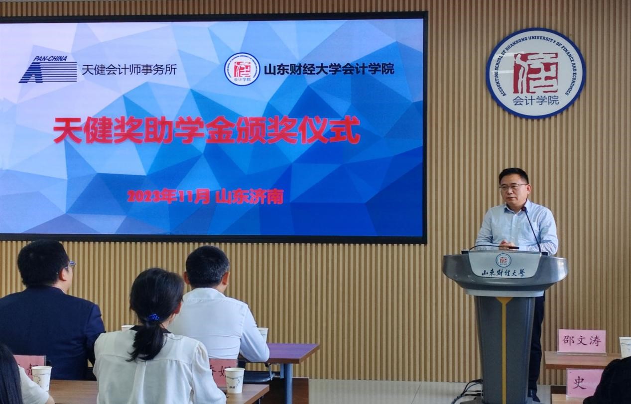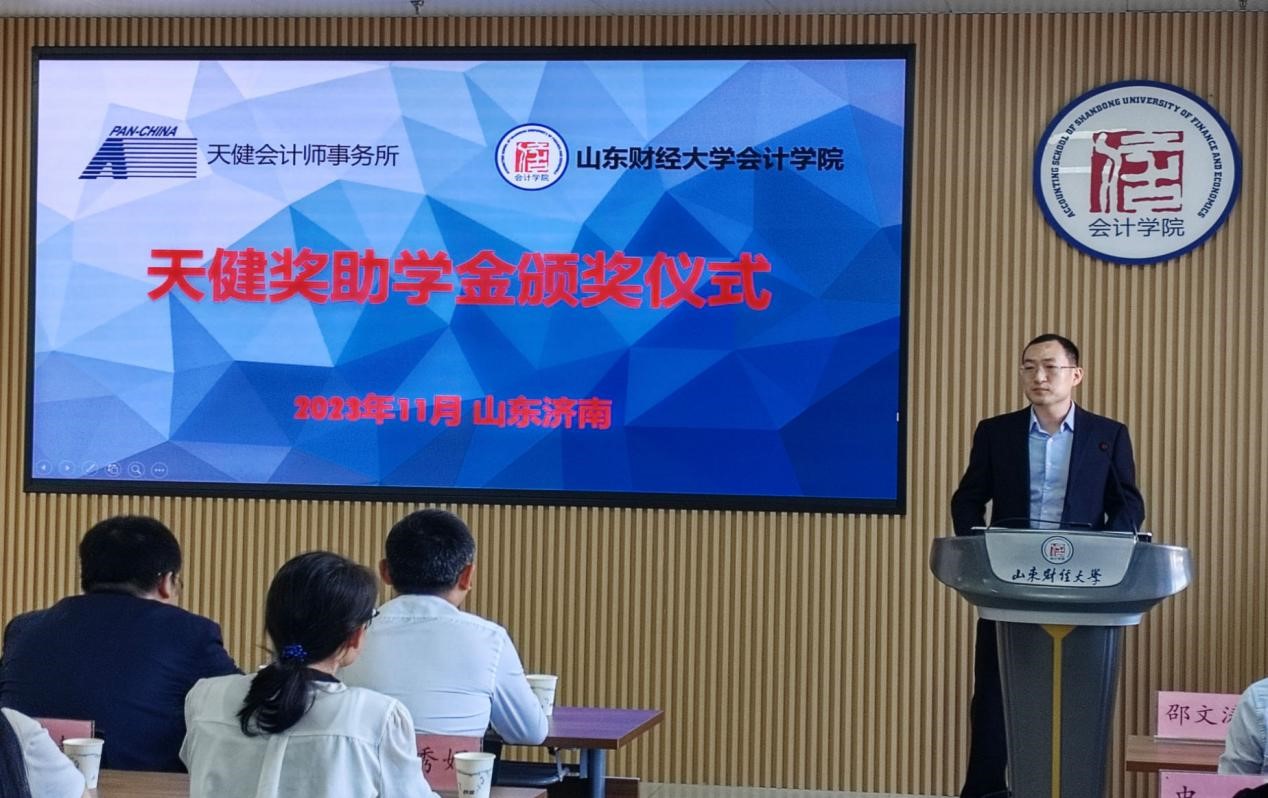 11月1日下午,2023年度天健就业奖助学金颁奖仪式在bat365官方官网燕山校区逸夫楼举行。天健会计师事务所高级合伙人、山东分所副总经理管金明,高级合伙人、主任会计师助理邓德祥,合伙人宋鑫,合伙人、山东分所总经理助理史钢伟,人力资源总部高级经理韩杰,人力资源总部助理经理林小靓,山东分所人力资源部经理宋小燕,bat365官方官网党委书记邵文涛以及教师代表、学生代表参加,仪式由辅导员史岩主持。