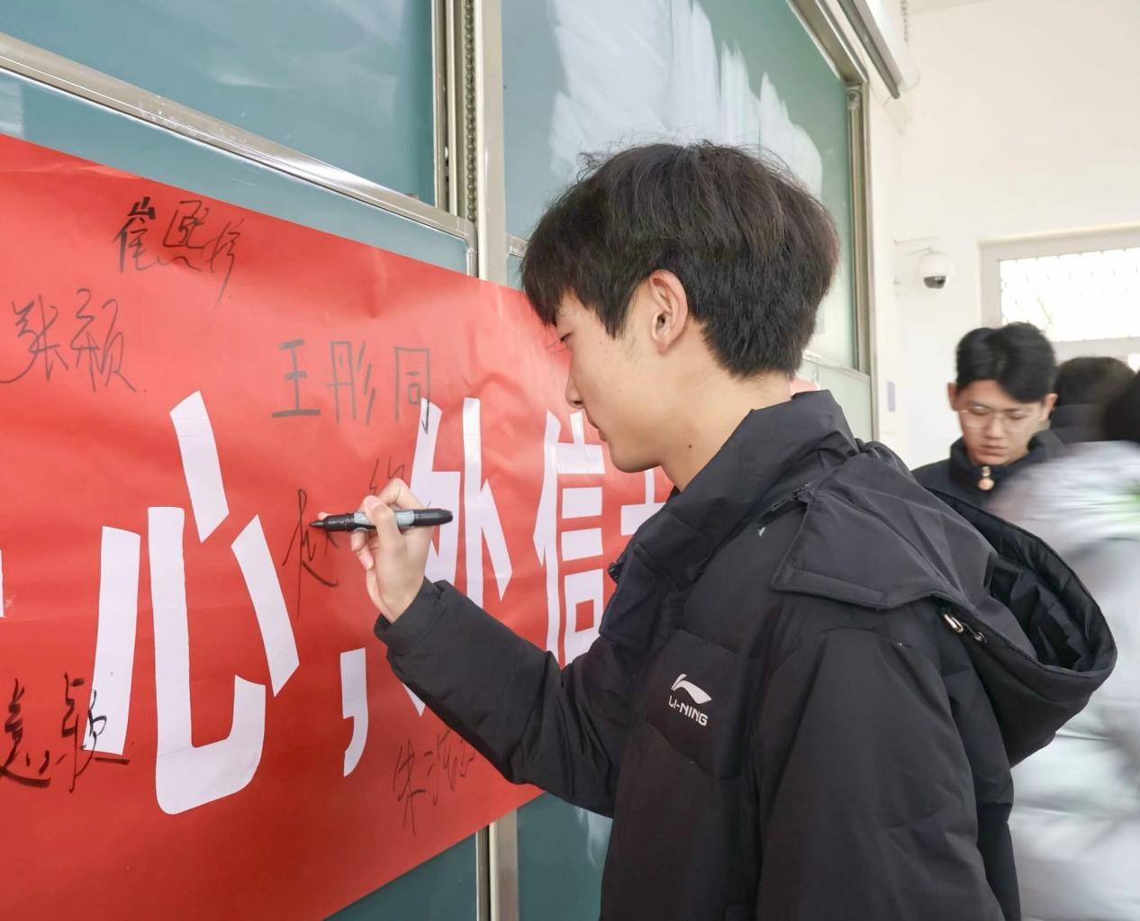 大会最后,各班学生代表依次上台在诚信应考条幅上签字。