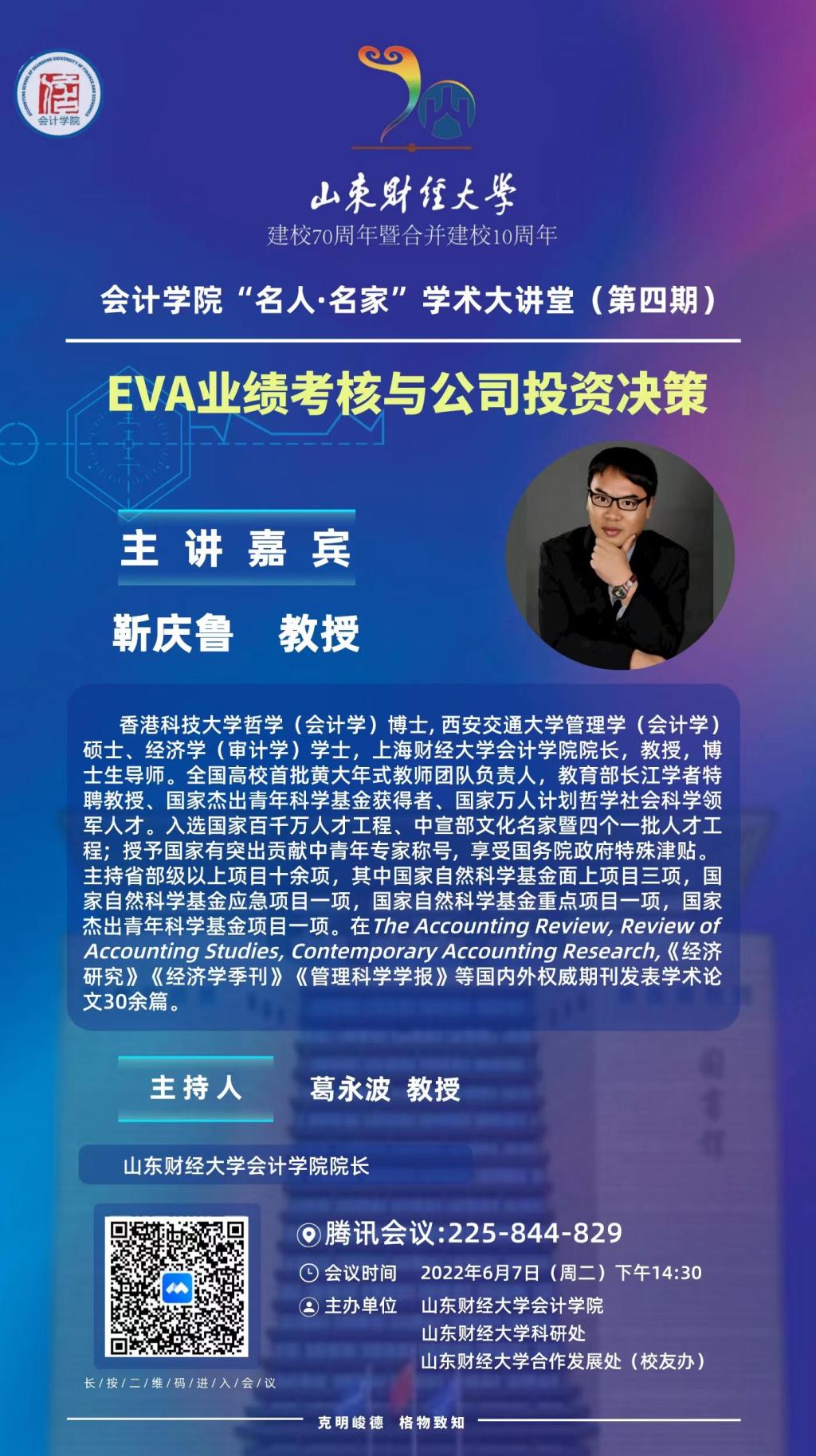 第四期“名人·名家”学术大讲堂将由上海财经大学bat365官方官网院长靳庆鲁主讲,主题为:EVA业绩考核与公司投资决策。
