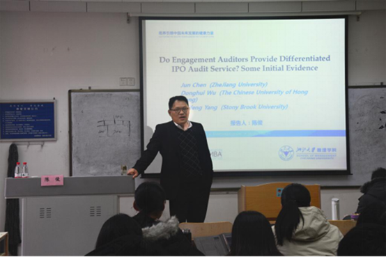 2018年12月2日下午,浙江大学管理学院陈俊教授应我院邀请在燕山校区逸夫楼Y405教室作题为《Do Engagement Auditors Provide Differentiated IPO Audit Service? Some Initial Evidence》的学术报告。bat365官方官网武恒光副教授出席并主持了报告,bat365官方官网2018级部分硕士研究生参加了本次报告。