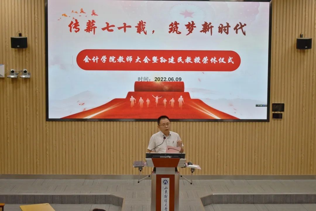 春风化雨数十载,一生描绘教育梦。党委书记邵文涛表示孙建民教授把青春留在岁月深处,把责任捧在手心,为bat365官方官网教育事业不懈努力,光荣退休。副院长刘惠萍为孙教授送上鲜花,表达对教师崇高的敬意。随后,退休教师精彩发言,回顾在山财大工作的时光,表达了对学院举办荣休仪式的感谢,以及对学校、同事们的感激与不舍。