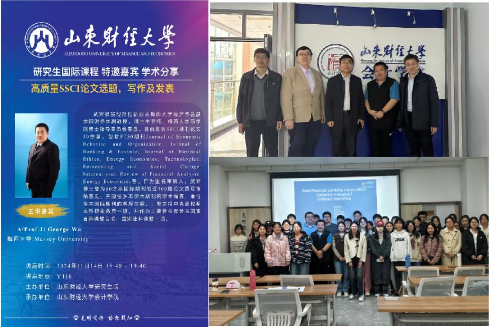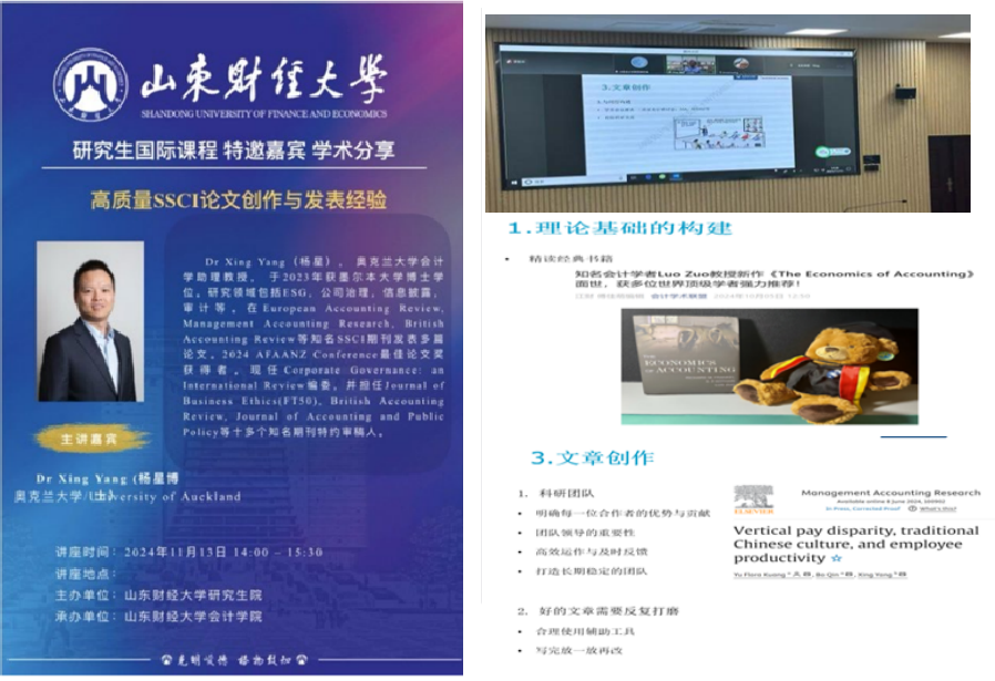 应学院邀请,澳大利亚伍伦贡大学黄泰然博士(Dr. Tairan Kevin Huang)为我院开设研究生国际化课程(《国际会计准则理论及学术前沿》)。黄泰然博士是澳大利亚伍伦贡大学商法学院高级讲师、研究生教学主管、伍伦贡大学商学院中国学生教育同盟会创始人、伍伦贡大学校长最高勋章获得者、澳大利亚国家博士奖学金获得者,兼任会计学术联盟学术指导委员会委员。课程以管理学研究方法论、经典文献选读及文献综述撰写为核心,内容深入而丰富,为我院硕士、博士研究生带提供了宝贵的学术训练机会。
