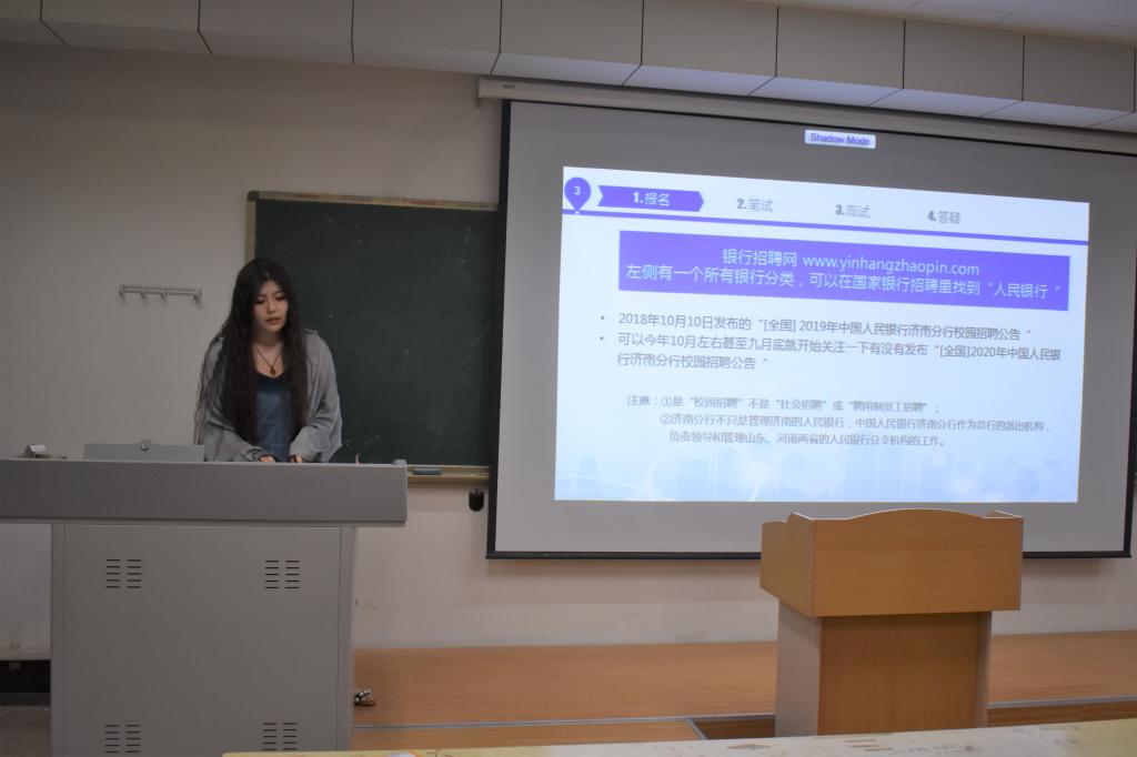 随后,被中国人民银行聊城市中心支行录取的郝逸群,围绕报名、笔试和面试三方面作了经验分享。关于报名,可以登录“银行招聘网”或关注“[全国]2020年中国人民银行济南分行校园招聘公告”,留意报名网站、报名及考试时间、注意事项等。提到笔试,她强调,报名后无重要原因必须要去考试,若有事不能参加,也须提前联系相关工作人员说明情况,否则人行会公示无故缺考的考生名单,对个人产生不良影响。关于面试,她指出,银行面试与公务员面试类似,采用结构化面试,场外思考、场内答题的形式。