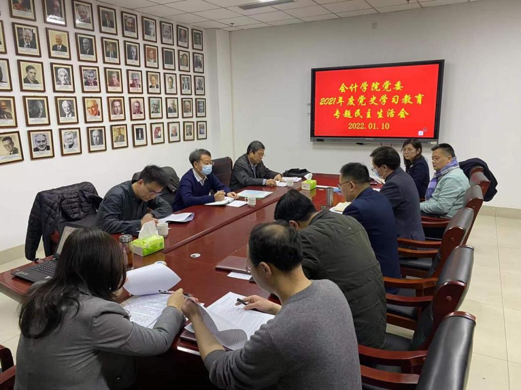 韩作生强调,要认真贯彻习近平新时代中国特色社会主义思想和党的十九届六中全会精神,进一步增强“四个意识”、坚定“四个自信”、做到“两个维护”,确保学院各项工作的高质量发展。要以本次党史学习教育专题民主生活会为契机,党员领导干部要以身作则,发挥好模范带头作用,要敢于攻坚克难。突出党建引领,党建工作要与业务融合发展、相互促进,重视人才队伍建设,以人才引进促进学科建设,在会计专业博士点建设上要有新的突破,为学校高质量内涵发展做出贡献。