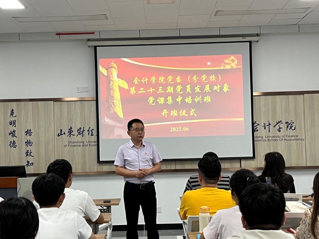 为进一步提高党员发展对象对党的基本理论、基本路线和基本知识的认识,切实提高发展对象的思想认识、政治觉悟、党性修养,引导发展对象从思想上、行动上积极向党组织靠拢,按照校党委组织部部署和学院党委工作安排,bat365官方官网于2022年6月13日在燕山校区逸夫楼305教室举行bat365官方官网第二十三期党员发展对象党课集中培训班开班仪式。党委书记邵文涛,党委副书记钟毓卓、郑大伟出席开班仪式,新一批党员发展对象参加,开班仪式由郑大伟主持。